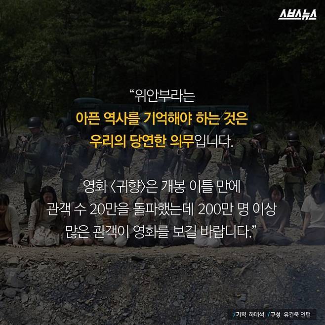 영화 <귀향>은 개봉 이틀 만에 관객 수 20만을 돌파했는데 200만 명 이상 많은 관객이 영화를 보길 바랍니다."