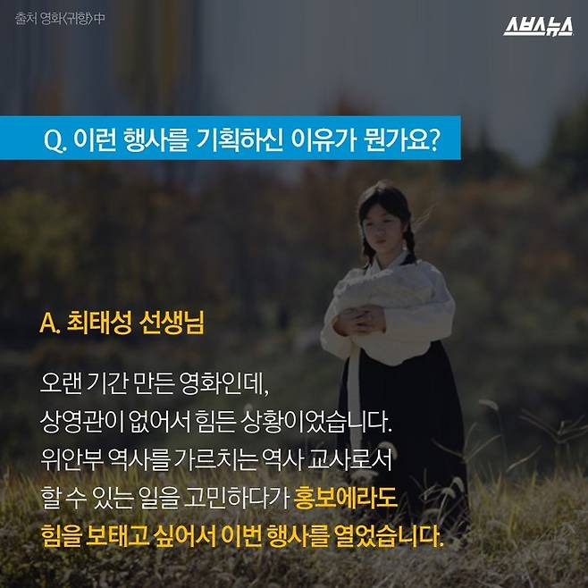 A. 최태성 선생님 : "오랜 기간 만든 영화인데, 상영관이 없어서 힘든 상황이었습니다. 위안부 역사를 가르치는 역사 교사로서 할 수 있는 일을 고민하다가 홍보에라도 힘을 보태고 싶어서 이번 행사를 열었습니다."