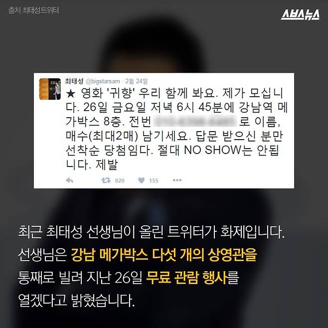 최근 최태성 선생님이 올린 트위터가 화제입니다. 선생님은 강남 메가박스 다섯 개의 상영관을 통째로 빌려 오늘(26일) 무료 관람 행사를 열겠다고 밝혔습니다. 사비를 털어 영화관을 통째로 빌린 최태성 선생님.