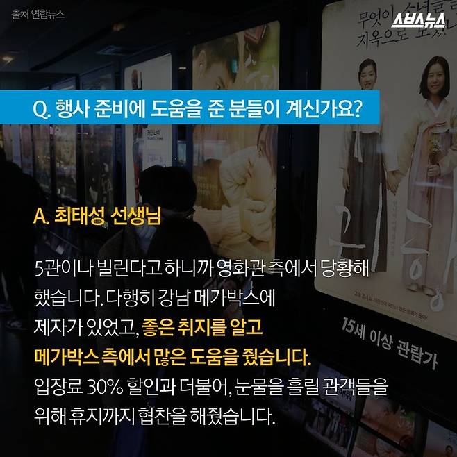 A. 최 : "5관이나 빌린다고 하니까 영화관 측에서 당황해 했습니다. 다행히 강남 메가박스에 제자가 있었고, 좋은 취지를 알고 메가박스 측에서 많은 도움을 줬습니다. 입장료 30% 할인과 더불어, 눈물을 흘릴 관객들을 위해 휴지까지 협찬을 해줬습니다."