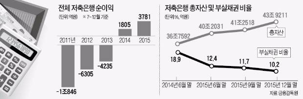 금융감독원이 29일 발표한 저축은행 2015년 하반기 영업실적에 따르면 79개 저축은행은 지난해 7~12월 3781억원의 순이익을 올렸다. 2014년 같은 기간 순이익 1805억원과 비교하면 1976억원(109.4%) 늘어난 규모다.