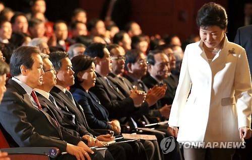 특히 박 대통령 기념사는 정의화 국회의장과 김무성 새누리당 대표, 김종인 더불어민주당 비상대책위 대표, 주승용 국민의당 원내대표, 심상정 정의당 대표 등이 참석한 가운데 이뤄져 국회 비판의 목소리가 더욱 도드라져 보이는 효과를 낳았다.