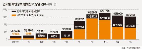 1일 한국인터넷진흥원이 운영하는 118사이버민원센터에 따르면 센터에 접수된 개인정보 침해신고 상담은 지난 2006년 2만3333건에서 2015년 15만2151건으로 10년 동안 7배 가까이 폭증했다. 특히 주민번호 등 타인 정보 도용 사례는 2015년 한 해에만 7만7598건이 발생해 2006년보다 7배 이상 늘었다.