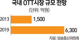 국내 OTT 시장의 절대적인 규모는 아직 미미하지만 그 성장 속도는 빨라지고 있다. 이에 따라 2013년 1,500억원이던 내수시장 규모는 오는 2019년 6,300억 원 규모에 이를 것으로 전망되고 있다.