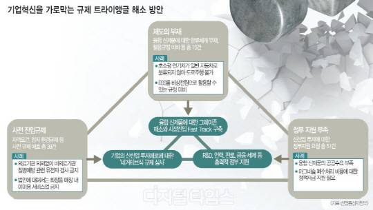이른바 '규제 트라이앵글'이 우리 경제 발목을 잡고 있다. 초소형 전기차 사례처럼 정부의 지나친 사전 승인 규제 때문에 기업이 새로운 상품을 개발해도 시장에 내다 팔 수가 없다.
