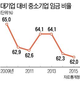 지난해 중소기업 근로자의 평균 임금은 대기업 대비 62.0%로 2008년 관련 통계를 집계한 이후 가장 낮았다. 2009년 65.0%였던 이 비율은 2010년 62.9%, 2011년 62.6%로 떨어지다 2012~2013년 64.1%로 일시적인 상승세를 보였다. 하지만 2014년 다시 62.3%로 떨어졌고 지난해 최저치를 기록했다.