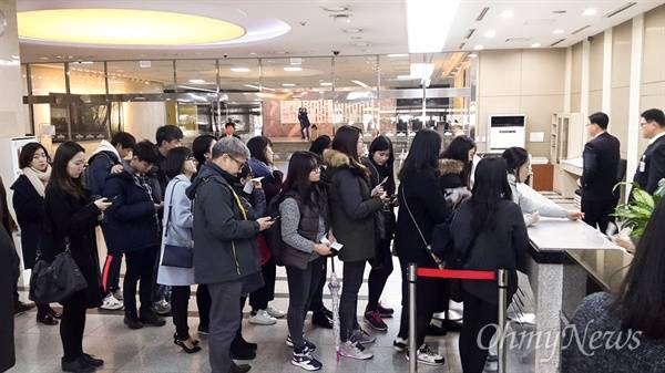 | ▲ '테러방지법'안에 대한 필리버스터 ,즉 국회 본회의 무제한 토론이 90시간을 넘어선 지난달 27일 오후 2시 경, 본회의 방청을 위해 국회의사당 후면 안내실을 찾았다가 번호표를 받고 대기중이던 방청객들이 의사당 안으로 들어가기 위해 신분증을 맡기는 절차를 위해 줄을 서 있다. |