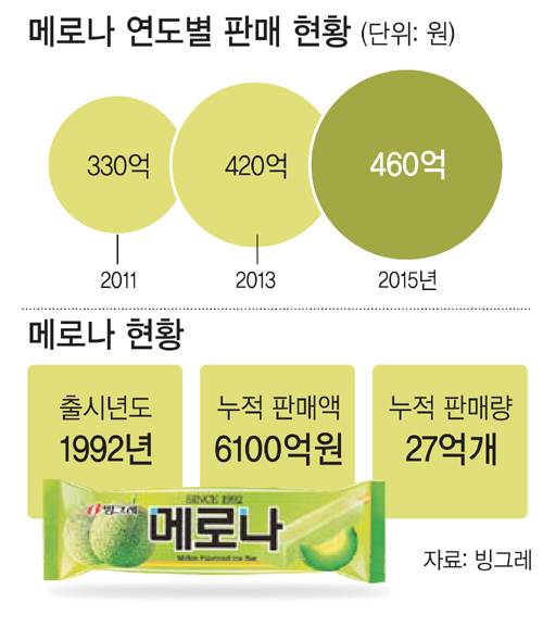 사각형의 진한 초록색으로 출시된 메로나는 출시되자마자 연간 210억원의 매출을 올리는 빅히트를 쳤다. 메로나는 1995년 미국 하와이 시장에 처음 진출한 이후 현재 전 세계 16개국에서 판매되고 있다. 메로나는 글로벌 시장 공략을 위해 멜론을 기본으로 딸기·바나나·망고·와플 등 다양한 맛이 라인업됐다. 조용국 빙그레 팀장은 “빙그레가 지난해 북남미시장에서 100억원의 매출을 올렸는데, 이 중 메로나의 판매비중이 가장 높다”며 “해외에서 브랜드 인지도가 높은 제품이라 올해부터는 현지매출을 늘리기 위해 프로모션 및 유통채널 확대에 주력하고 있다”고 말했다.