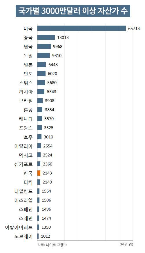 한국에서 순자산만 3000만달러(약 365억원)가 넘는 부자는 지난해 기준으로 2143명인 것으로 집계됐다. 경기침체 여파로 2014년보다 66명 줄었지만 10년 뒤엔 3322명으로 늘 것으로 예상됐다.
