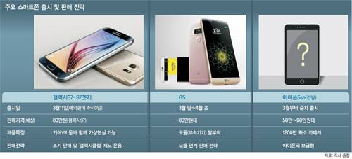 이동통신 업계 관계자는 “갤럭시S7와 G5는 프리미엄폰인 반면 아이폰의 새 스마트폰은 보급형이고 출시 시점도 1, 2개월 차이가 있지만 아이폰 마니아층이 두꺼워 국내 업체들엔 상당한 부담이 될 전망”이라며 “메이저 제조사들이 3월부터 일제히 판매에 나서면서 경쟁이 조기에 가열되는 것도 특징”이라고 분석했다.
