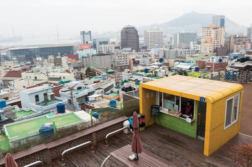 높은 곳에 서니 집집마다 옥상이 보인다. 집에서 쓰지 않는 것들이나 고추장독, 된장독 등이 나란히 올려져 있다. 빨랫줄에는 어제 입었던 일바지가 펄럭인다. 사다리를 놓고 오르는 작은 옥상에 치우지 않은 역기 의자가 보인다. 언제부터 거기 있었는지 모르겠지만 의자 부분의 스폰지가 터져 나오고 심하게 녹슨 모양이 더 이상 기능을 할 수 없을 것 같다. 지금은 고물이 됐지만 누군가는 바벨을 들고 부산항을 내려다 보며 꿈을 꾸었을 것이다. 건강한 청년이었겠지….