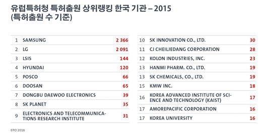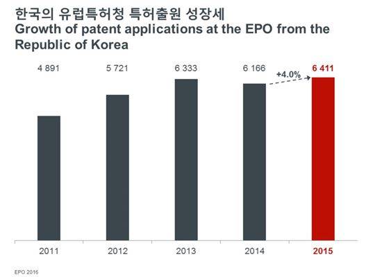 3일(현지시간) 유럽특허청(EPO)이 밝힌 2015년 각 국가별 특허출원 현황에 따르면 한국의 특허출원건수는 전년도(6166건)에 비해 4% 증가한 6411건으로 역대 최다를 기록했다.