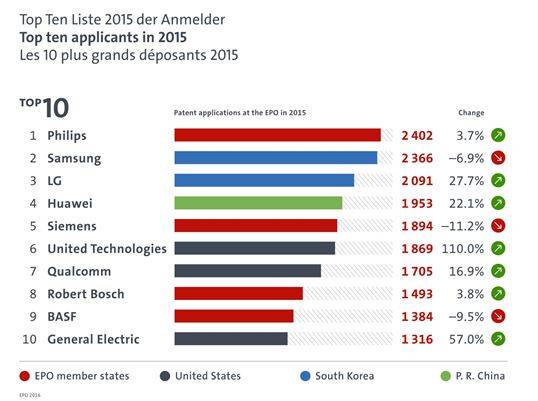 기업별로는 필립스가 2402건의 특허를 출원해 전체 1위를 차지했으며 삼성전자는 2360건으로 2위, LG전자는 2091건으로 3위에 올랐다. 삼성전자는 전년보다 6.9% 줄었으며 LG전자는 27.7% 증가했다. 중국의 화웨이가 전년보다 22.1% 증가한 1953건의 특허를 출원했으며 지멘스는 11.1% 감소한 1894건의 특허를 출원해 각각 4, 5위에 랭크됐다.