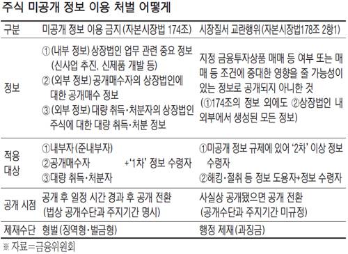지난해 하반기 금융투자협회가 증권사 애널리스트와 자산운용사나 투자자문사의 펀드매니저로부터 접수한 주식 불공정거래 처벌 관련 질문들이다. 금융당국은 미공개 중요 정보의 2차, 3차 등 다차 수령자도 처벌하는 내용의 시장질서 교란행위 규제를 작년 7월부터 시행했다.