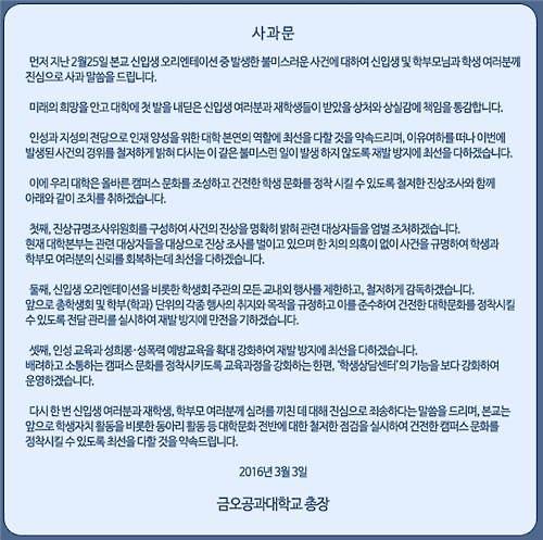 금오공대는 총장 명의로 대학 홈페이지에 "불미스러운 사건에 대해 신입생, 학부모, 재학생 여러분께 진심으로 사과 말씀드린다"며 "재발 방지와 건전한 캠퍼스 문화를 정착하겠다"는 사과문을 게시했다.