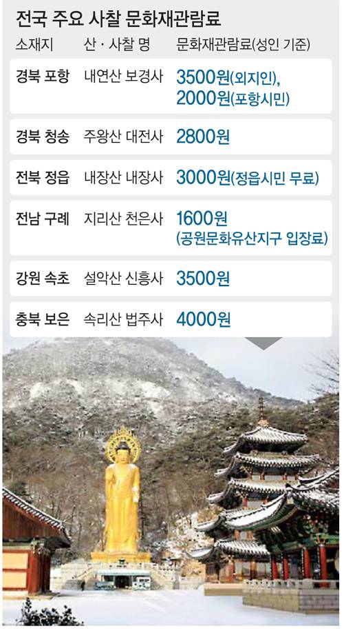 사찰의 문화재관람료 징수는 ‘국가지정문화재 소유자는 문화재를 공개하는 경우 관람료를 징수할 수 있다’는 문화재보호법 제49조에 근거하고 있다. 문화재관람료는 문화재 유지·관리비용 등을 충당하기 위한 목적으로 1962년 처음 도입됐다. 1970년부터는 속리산을 시작으로 국립공원 입장료가 문화재(사찰)관람료와 통합 징수돼 왔다. 2007년 1월부터는 국립공원 입장료가 폐지됐다. 문화재 보호·관리에 비용이 필요하다는 게 사찰 측 입장이다.