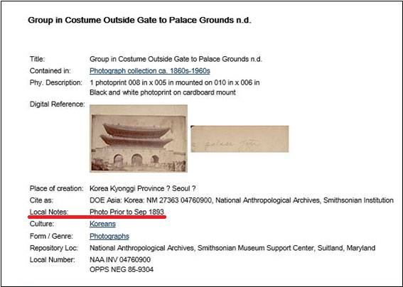 미국 스미스소니언박물관의 ‘국가 인류학 자료보관소’ 홈페이지입니다. 여기에 들어가서 ‘korea palace gate’로 검색하면 위에 보시는 것처럼 광화문 사진 세 장이 나란히 나옵니다. 맨 위 사진을 열어보시면 바로 그 문제의 광화문 현판이 등장합니다. 아래 주소를 누르시면 사진을 보실 수 있습니다.