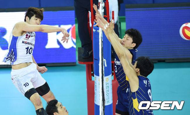 4세트 6-6에서 김학민의 블로킹으로 대한항공이 7-6 역전에 성공했다. 대한항공은 시소게임 속 모로즈의 서브에이스로 14-11로 달아났다. 한국전력은 끝까지 힘을 냈으나 봄배구를 향한 의지가 강한 대한항공의 기세를 막지 못했다. 대한항공은 홈에서 포스트시즌 확정의 기쁨을 맛봤다. /autumnbb@osen.co.kr
