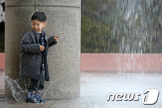 (전주=뉴스1) 김대홍 기자 = 5일 전북 전주시 삼성문화회관 앞에서 한 어린이가 장대비에 고인 물웅덩이에서 장난을 치고 있다. 2016.3.5/뉴스1
