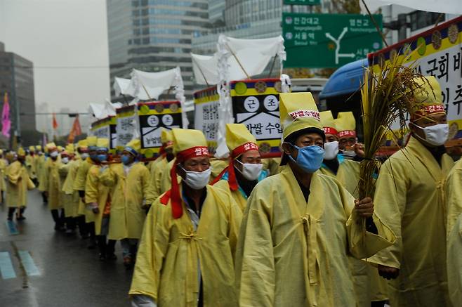 ▲ 2015년 11월 14일 민중총궐기 당시 농민들이 '밥쌀 수입 반대' 등의 구호가 적힌 상여를 짊어지고 행진하고 있다.