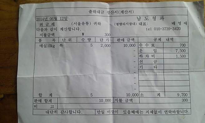 ▲ 최금례 씨가 공판장에 매실 10kg짜리 5박스를 팔고 받은 영수증(2014년 6월 14일에 올라온 사진) 10000원에서 수수료 9700원을 뺀 300원을 수령했다고 나와 있다.