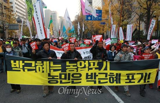 ▲ 전국에서 상경한 농민과 시민들이 2014년 11월 20일 오후 서울 중구 서울시청광장에서 열린 '한중FTA저지 쌀전면개방반대 식량주권과 먹거리안전을 위한 3차 범국민대회'를 마친 뒤 식량주권을 포기하는 박근혜 정권을 규탄하며 거리행진을 벌이고 있다.