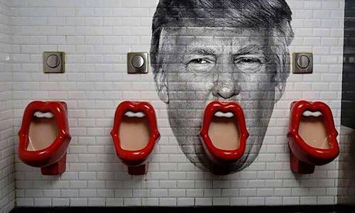 정치 풍자가 패러디를 넘어 예술로 승화한 경우도 있다. 지난해 11월 프랑스 파리 한 술집 화장실에는 롤링스톤즈 앨범 자켓에서 흔히 볼 수 있는 입술 모양의 소변기에다 트럼프 입을 맞춘 벽화가 등장해 화제를 모았다. 막말을 일삼는 트럼프의 입에다 오줌을 갈기자라는 뜻으로 해석됐다.