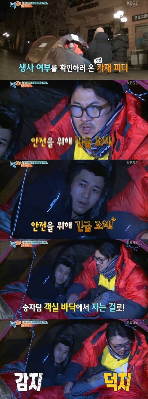 잠든 지 두 시간 째 유호진 PD는 텐트로 다가와 "살아 계시냐. 생각보다 기온이 빨리 떨어져서 나머지 시간 동안은 객실 바닥에서 자야 할 것 같다"고 말했다.