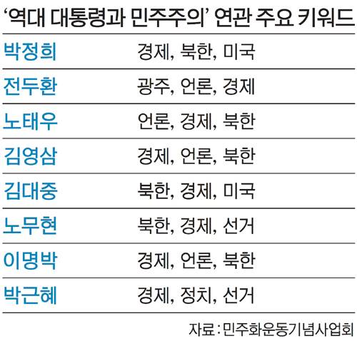 역대 대통령들의 이름과 민주주의가 동시에 언급된 글 가운데 여당 출신 대통령은 ‘경제’, 야당 출신 대통령은 ‘북한’이 각각 가장 많이 등장한 것으로 조사됐다.