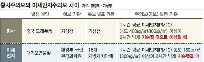 기상청은 황사주의보를 사전에, 지자체는 미세먼지주의보를 사후에 발령하는 모양새입니다. 황사 예보는 옅든지 짙든지 황사가 올 것으로 보인다는 의미이고, 황사주의보는 황사가 실제로 심해질 것 같으니 외출 자제 등 대비를 하라는 뜻입니다. 하지만 미세먼지 예보에는 이미 어떻게 행동하라는 내용까지 포함돼 있습니다. 가령 미세먼지 예보 단계가 ‘나쁨’이나 ‘매우 나쁨’이면 장시간 실외활동을 자제하라는 뜻이 담겨 있습니다. 미세먼지주의보(경보)는 시민에게 알리는 정보이기도 하지만 야외체육시설 제한, 실외수업 중단, 자동차 운행 감축 등 행정기관이 통제활동을 시작하는 기준입니다.