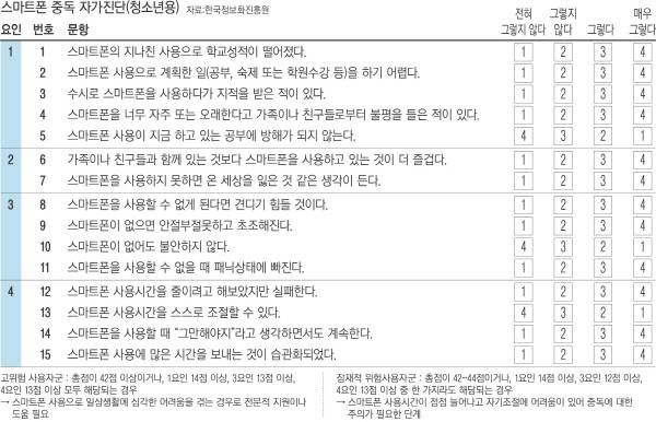 정부는 청소년 스마트폰 과다사용 해소를 위해 연령별로 맞춤형 프로그램을 운영 중이다. 초등학생 아이가 스마트폰을 너무 많이 사용해 고민이 된다면 자녀와 함께 참여하는 가족치유캠프의 문을 두드려보자. 여성가족부가 운영하는 2박3일 일정의 가족치유캠프는 4학년 이상 초등학생을 대상으로 하는데, 반드시 부모 중 한 사람이 함께 참여해 교육을 받아야 한다. 집단상담과 부모교육, 수련활동, 대안활동, 사후모임 등의 프로그램이 제공된다. 참가비는 무료이며 1인당 식비 1만5000원만 내면 된다. 시·도 단위에 설치된 17개 청소년상담복지센터나 청소년 전화 1388(휴대전화 시 지역번호+1388)을 통해 문의하면 된다.