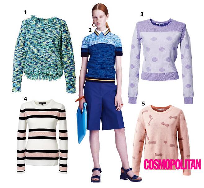 CROPPED KNIT패턴이 가미된 크롭트 니트를 다가올 봄 쇼핑 리스트에 올려놓자. 몸에 피트되는 슬릿 스커트 혹은 플리츠 스커트와 매치하면 여성미를 강조한 오피스 룩이 단번에 완성된다. 1.29만8천원 오즈세컨 2.Jil Sander Navy 3.59만원 카르벵 4.3만9천8백원 에이치커넥트 5.27만5천원 SJ SJ
