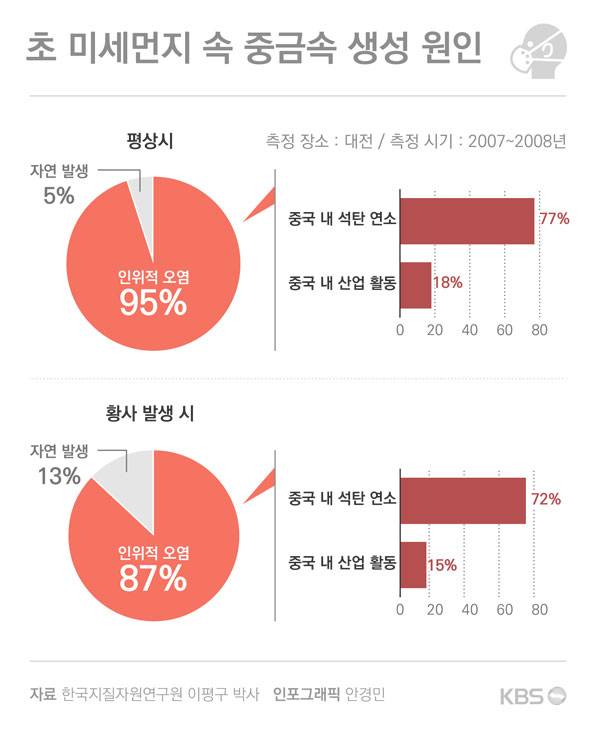 최근 국내 연구진이 국내 초미세먼지 속 중금속의 기원을 밝히는 연구 결과를 발표했다. (한국지질자원연구원 이평구 박사, 국제저널 Environmental Pollution 2016년 3월호) 결과부터 확인해 보면 평소에는 초미세먼지 속 중금속의 95%가, 어제오늘처럼 황사가 밀려올 때는 87%가 '중국산'임이 드러났다. 자연적으로 발생한 13%를 제외하면 황사 시기에도 대부분의 중금속이 중국에서 발생한 인위적인 오염 물질이란 뜻이다. 87% 중 중국 내 석탄 연소로 인한 오염이 72%, 산업 활동으로 인한 오염이 15%를 차지한다.