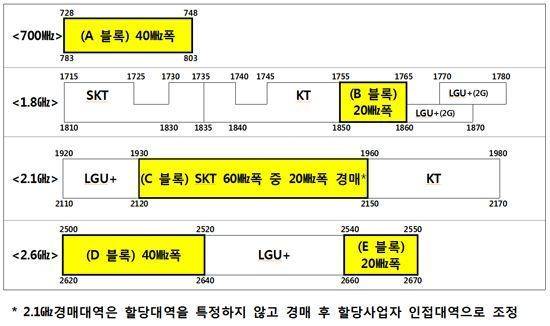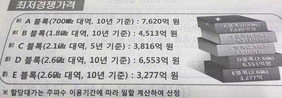 이중 SK텔레콤, KT, LG유플러스 등 사업자들이 문제를 제기한 부분은 C블록(2.1㎓, 20㎒ 폭)에 대한 최저경쟁가다. 정부가 정한 C블록 최저경쟁가는 5년 기준 3천816억원이다.