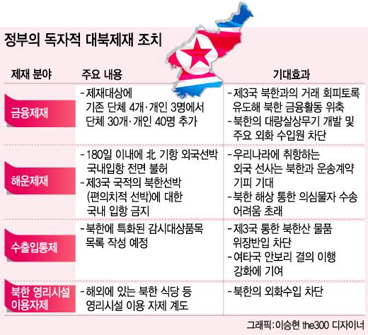 정부가 8일 북한에 대한 금융제재를 확대하고 해운 통제를 강화하는 내용의 독자적 대북제재 조치를 발표했다. 유엔 안전보장이사회의 제재결의 이후 전세계적인 독자제재 움직임에 힘을 보태며 북한을 옥죄는 상징적 의미가 큰 것으로 분석되는데 실효성에는 평가가 엇갈린다.