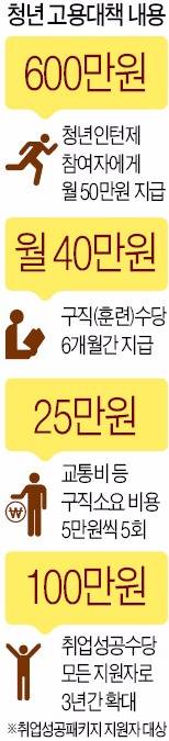 구직자뿐만 아니라 취업에 성공한 청년들에게도 막대한 현금을 푼다. 정부는 현재 청년취업인턴제에 참여한 청년이 3개월 인턴 후 정규직으로 전환되면 최대 300만원(제조업 생산직 외 직종은 180만원)을 지급하고, 해당 기업에는 최대 390만원을 지원하고 있다. 정부의 이번 대책은 그동안 기업에 더 많이 지원한 보조금의 상당 부분을 개인에게 주겠다는 것으로, 인턴 후 정규직으로 전환된 청년들에게 1인당 600만원의 보조금을 지급할 계획이다. 기업들이 고용보조금을 받아 임금을 올려주거나 채용을 늘리지 않고 인건비 절감 수단으로 활용하는 측면이 있다는 판단에서다.