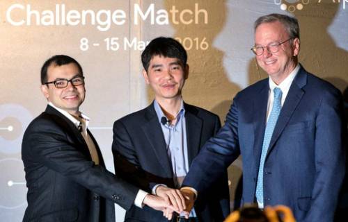 이세돌 9단(가운데)이 구글이 만든 인공지능 바둑 프로그램 `알파고`와의 맞대결을 하루 앞둔 8일 서울 종로구 포시즌스호텔에서 열린 사전 브리핑에 참석해 구글 딥마인드의 CEO 데미스 하사비스(왼쪽), 에릭 슈미트 구글 회장과 손을 맞잡고 있다. 권욱기자