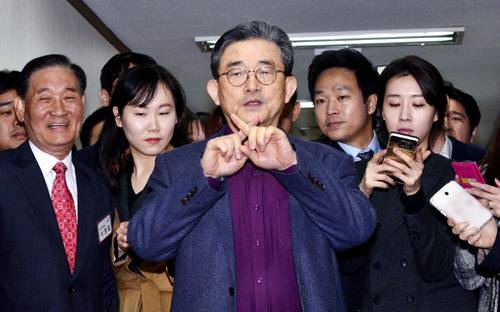 새누리당 이한구 공천관리위원장이 8일 오전 서울 여의도 당사에서 총선 후보자 공천심사에 앞서 기자들의 질문에 답하며 손가락으로 X자를 그려 보이고 있다. 이재문 기자