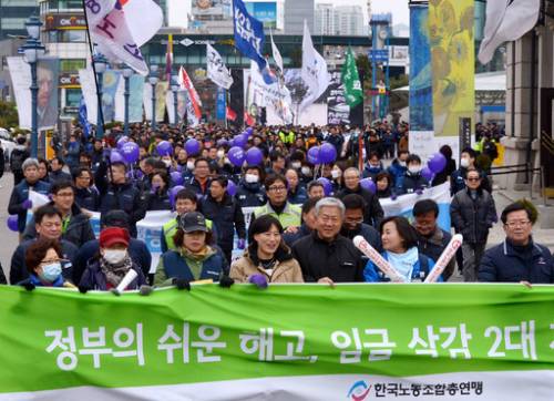 | 8일 오후 서울 용산구 서울역 광장에서 세계 여성의 날을 맞아 열린 전국 여성 노동자대회에서 참가자들이 행진하고 있다. 하상윤 기자 |