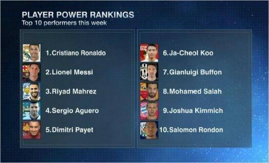 2위는 ‘축구의 신’ 리오넬 메시가 차지했고, 3위는 레스터 시티의 리야드 마레즈, 4위는 맨체스터 시티의 공격수 세르히오 아구에로가 이름을 올렸다.