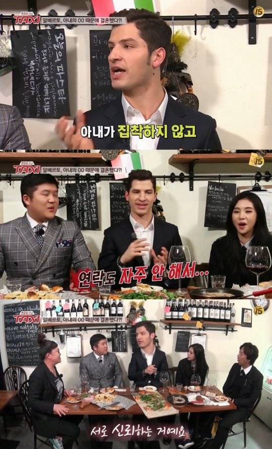 이에 MC 오만석이 “이탈리아 여자도 많은데 굳이 한국여자와 결혼한 이유가 뭐냐”고 묻자 알베르토는 “와이프가 집착하지 않고 연락도 자주 안한다. 서로 신뢰하는 거다”라고 답했다.