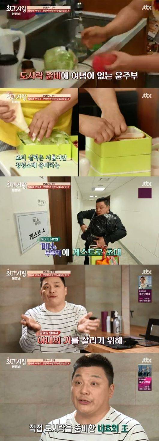 이어 윤정수는 도시락을 챙기고 촬영장을 찾아갔다. 윤정수는 "내조를 잘해주고 싶었다. 동료들 앞에서 아내의 기를 살리기 위해서 준비했다. 직접 도시락을 준비해서 나눠주고 싶었다"고 했다.