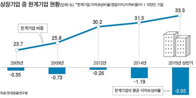하지만 전문가들 사이에선 최근 한계기업 증가 속도가 심상치 않아 구조조정 속도를 한층 높여야 한다는 지적이 계속 제기되고 있다. 김영욱 한국금융연구원 자문위원은 지난 8일 국가미래연구원 등의 주최로 열린 ‘부실기업 실태와 구조조정 방안’ 토론회에서 “국내 상장사 중 이자보상배율 1.0 미만의 한계기업 비중은 2005년 23.7%에서 작년 상반기 33.3%로 10% 가까이 증가했고, 30대 그룹 중 17개 그룹이 2012~2014년 3년 연속 이자보상배율 1.0을 밑돈 만성적 한계기업이었다”며 “더 늦기 전에 구조조정을 서둘러야 한다”고 주장했다. 작년 3월말 기준 국내 기업부채(약 2,347조원) 가운데 500조원이 한계기업의 부채여서 국내 기업들의 채무불이행(디폴트) 위험이 갈수록 높아지고 있다고 그는 덧붙였다.