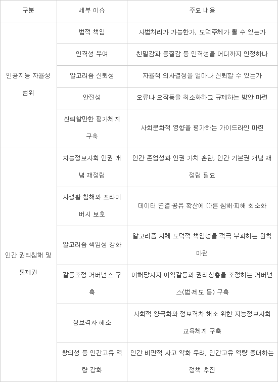 법·제도 차원 문제도 발생한다. 정보통신정책연구원(KISDI)은 ‘인공지능의 규범이슈와 정책적 시사점’ 보고서에서 △법적 책임 △인격성 부여 △안전성 문제 등을 지적했다. 이원태 KISDI 연구위원은 “인공지능 기술 확산으로 기존 인간 중심 규범의 근본적 변화가 불가피하다”며 “인공지능 시대 새로운 규범체계를 모색해야 한다”고 밝혔다.