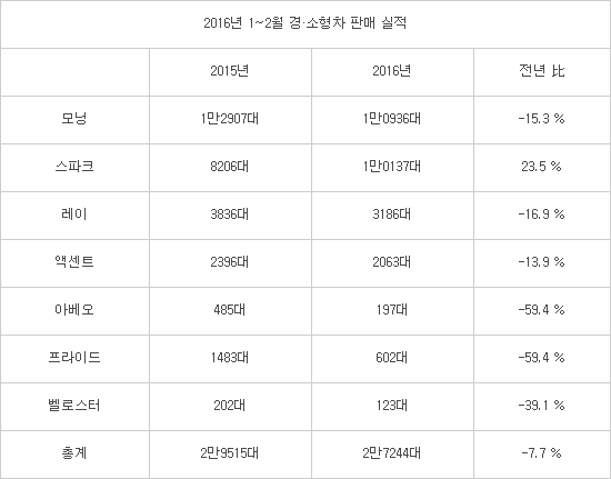 10일 한국자동차산업협회(KAMA)에 따르면 올해 들어 2월까지 국산 경·소형차 판매량이 전년 동기 대비 7.7% 감소한 2만7244대를 기록했다. 한국지엠 경차 ‘스파크’만 지난해 같은 기간보다 23.5% 성장했을 뿐 나머지 모델은 판매량이 줄어들었다.