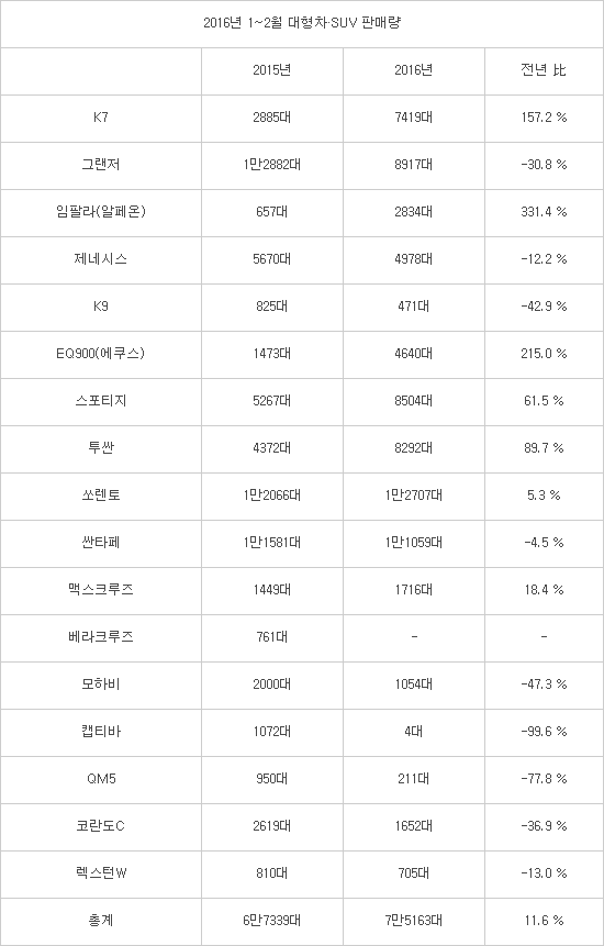반면에 대형차, SUV 등 가격이 비싼 차급에서는 개소세 인하 연장 혜택을 톡톡히 보고 있다. 올해 들어 2월까지 국산 대형세단·SUV 판매량은 전년 동기 대비 11.6% 증가한 7만5163대를 기록했다. 투싼, 스포티지 등 준중형 SUV 판매량은 전년 동기 대비 41.3% 증가한 1만8659대에 달했다.