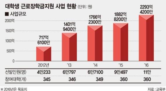 10일 교육부의 2016학년도 국가근로장학사업 계획에 따르면 올해 사업규모는 2293억4200여만원(다문화.탈북학생 멘토링, 대학생 청소년교육지원 사업 제외)으로 지난해 1882억8200여만원 보다 21.1% 늘어났다. 이에 따라 장학금 지원인원도 지난해 9만497명에서 올해는 11만명으로 늘어날 전망이다.