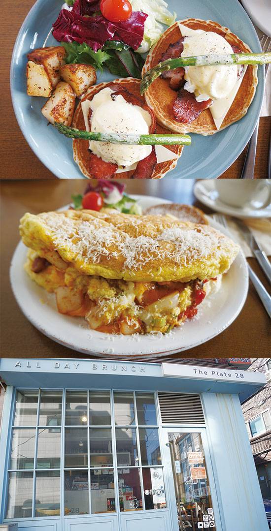 28cm의 접시를 주로 사용하여 ‘더 플레이트 28’이라는 이름을 갖게 된 작은 브런치 레스토랑이다. 입소문이 나면서 주말이면 내방역 근처 골목 안이 시끌시끌해질 정도다. 일반 브런치 카페에서 쉽게 접할 수 있는 팬케이크, 오믈렛, 샐러드, 에그 베네딕트 등 메뉴는 평범하지만 건강한 식재료로 만든 바르고 정성스런 음식이라는 것이 사진만 봐도 느껴진다. 토마토 소스에 볶은 야채와 베이컨, 치즈가 듬뿍 들어간 파머스 수플렛 오믈렛은 폭신한 식감이 일품이다. 단연 최고의 인기 메뉴는 시그니처 메뉴인 ‘28’s 에그 베네딕트’다. 잉글리시 머핀 대신 메밀 가루로 반죽한 핫케이크 위에 스위스 치즈, 케네디안 베이컨, 포치드 에그, 아스파라거스를 얹었다. 파머스 수플렛 오믈렛, 28’s 에그 베네딕트 각각 1만6000원.