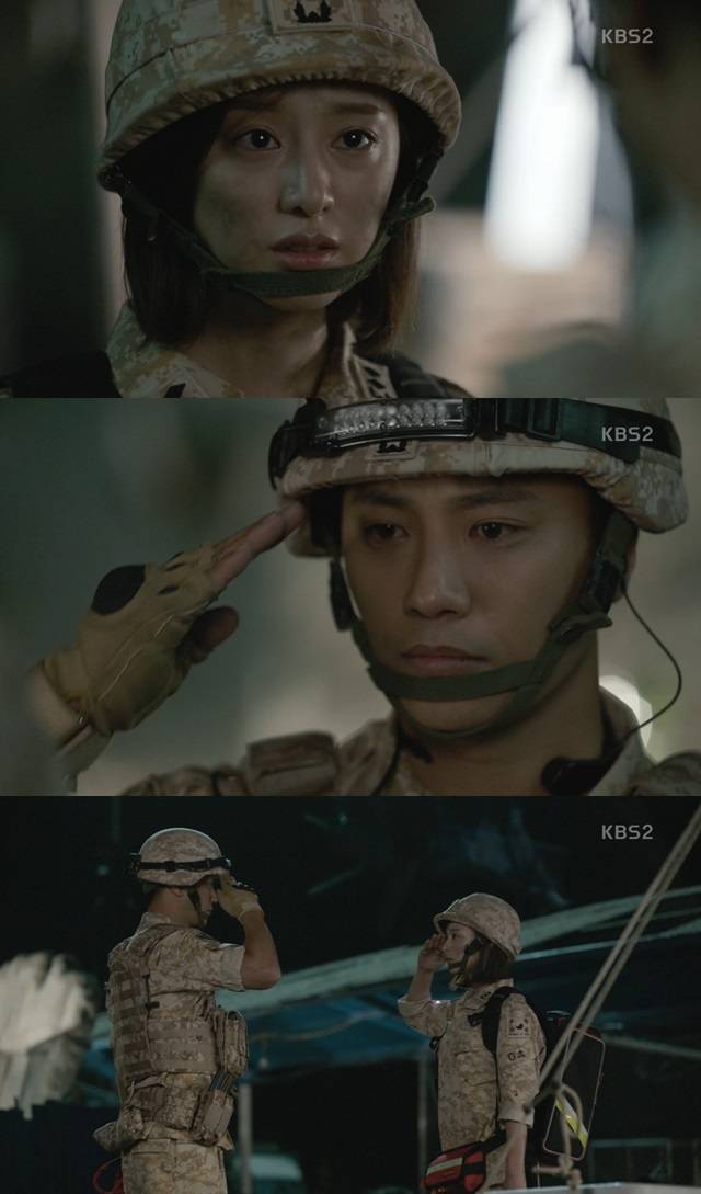 서대영의 도착 소식을 들은 윤명주는 서대영에게 달려와 "다치지마십시오. 명령입니다. 목숨 걸고 지키십시오. 알겠습니까"라고 당부했다. 두 사람은 군인답게 거수 경례를 주고 받았다. 윤명주의 명령과 서대영의 경례는 별다른 애정 표현 없이도 시청자들의 마음을 뭉클하게 했다. (사진=KBS 2TV '태양의 후예' 5회 캡처)