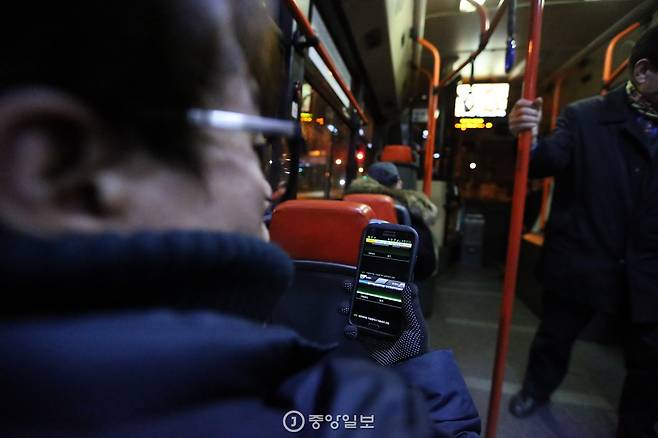 난 마지막으로 0시30분에 출발하는 막차 손님들에 대해서 말할 거야. 이 차를 타는 승객들은 술을 먹고 취한 분은 거의 없어. 밤 10~11시 대에는 이런 분들이 간간이 보이지만 막차에는 거의 없다고 말해도 될 정도야. 일 마친 뒤 피곤한 몸을 이끌고 타거나, 버스에 탄 뒤에도 계속 일하는 분들이 많아. 계속 일하는 분들은 손에 스마트폰을 들고 확인을 하고 있지. 대리기사 일을 하시는 분이야. 막차 승객 중에 가장 많아.서울 불광동에 사는 김경석(59,남)씨는 대리운전을 1년 했어. 자영업을 했는데 잘 안되면서 대리운전을 하게 됐어. 거리에 따라 2만5000원, 3만 원을 받고 일한다고 해. 고양시로 간 뒤 서울로 오려면 대리운전 기사 4명이 모여 1인당 3000원을 내고 택시를 타기도 해. 보통 고양시 라페스타에 대리기사들이 많이 모여 있어.윤동준(47, 남)씨도 대리운전을 하는데 고양시 토당동에서 혼자 사셔. 보통 저녁 7~8시쯤 집을 나선 뒤 새벽 4시까지 일한대. 한 달 열심히 하면 200~250만 원정도 번다고 해. 첫 손님이 고양 능곡에서 서울 발산동 가는 손님인 줄 알고 좋아했는데, 고양시 정발산동이어서 실망했다고 해. 거리가 가까워 금액이 싸기 때문이야. 1만2000원 받았데. 오늘은 좀 일찍 들어가는 거래. 새벽 3시인데 손님이 별로 없고 때마침 집 근처로 가는 이 버스가 와서 탔다고 하셔.